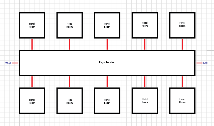 The player location can represent anywhere in physical space: a forest clearing, a small cave chamber, a grand ballroom. Adding the “up” and “down” directions provides a good deal of movement options including 3-dimensional flexibility, for a total of 10 choices for player movement from any given location in the game. However, particular real locations can be difficult to reproducing using the compass rose navigational framework without making overly compromising game navigation decisions. For example, suppose we’re dealing with a long hallway with many doors on both sides, like a hotel hallway: